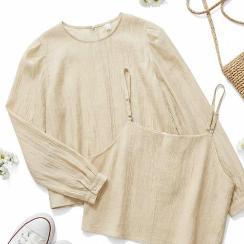 뷔스티에 블라우스 세트 퍼프 긴팔 라운드넥 여성 빅사이즈