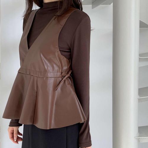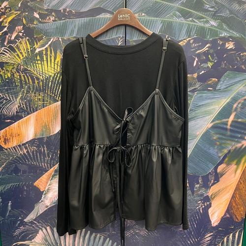 [신상오픈런]여성 키치 무드 긴팔 티셔츠 레더 브이넥 뷔스티에 세트