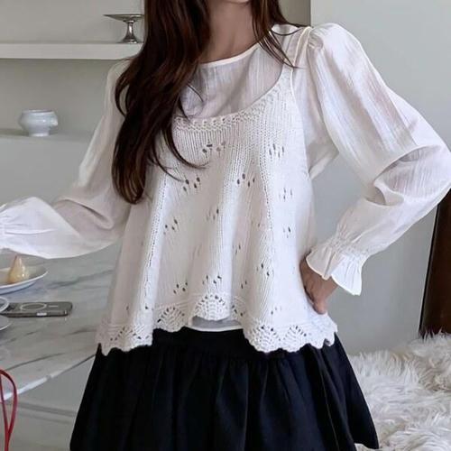 [디자이너몰]펀칭 니트 뷔스티에 셔링 블라우스 세트