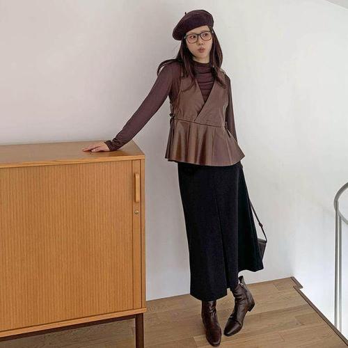 [옷자락]여자 키치무드 긴팔티 레더 브이넥 뷔스티에 세트