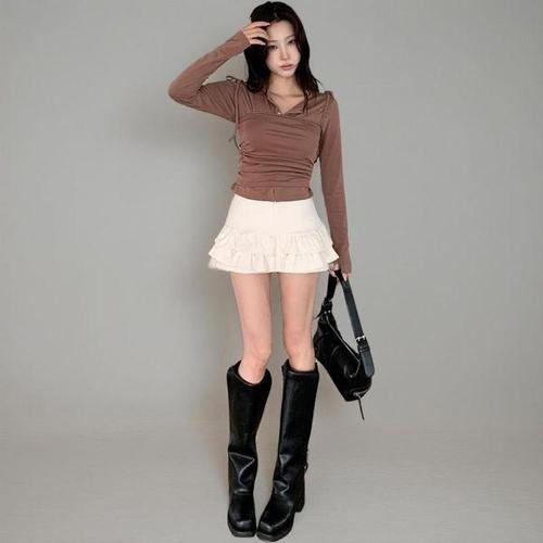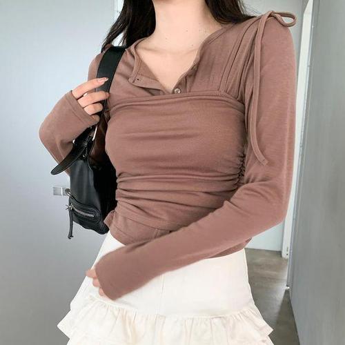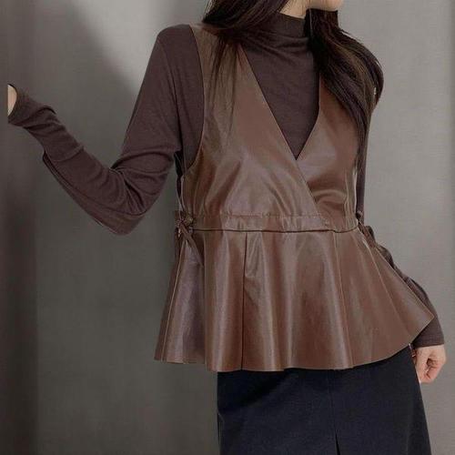 [신상오픈런]여성 키치 스타일 긴팔 티셔츠 레더 브이넥 뷔스티에 세트