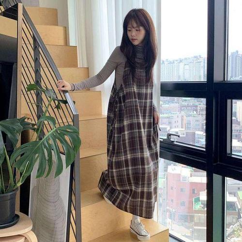 체크 뷔스티에 롱원피스 나시 데일리룩