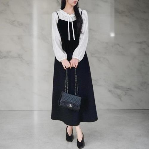 뷔스티에 리본 롱니트 원피스 레이 끈나시 여성 WFKOIIS