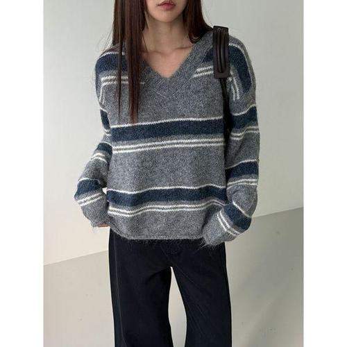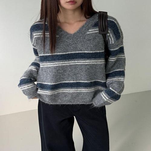 [하젤]브리치 스트라이프 브이넥 울니트_F4216