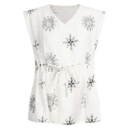 여성 브이넥 나염 빈티지 허리끈 민소매 블라우스 NTT-WBL-20755-아이보리