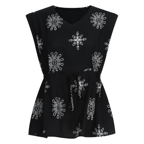 여성 브이넥 나염 빈티지 허리끈 민소매 블라우스 NTT-WBL-20755-블랙