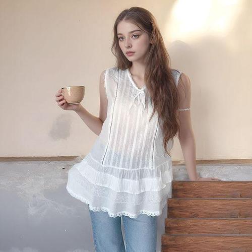 [모노무드]모노무드 브이넥 레이스 민소매 블라우스 여름 에어리 탑 여성