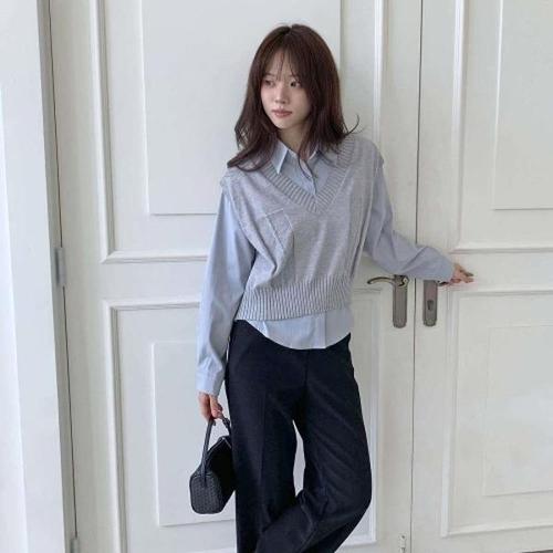 [디자이너몰]여성 브이넥 크롭 니트 조끼 베이직 셔츠 세트
