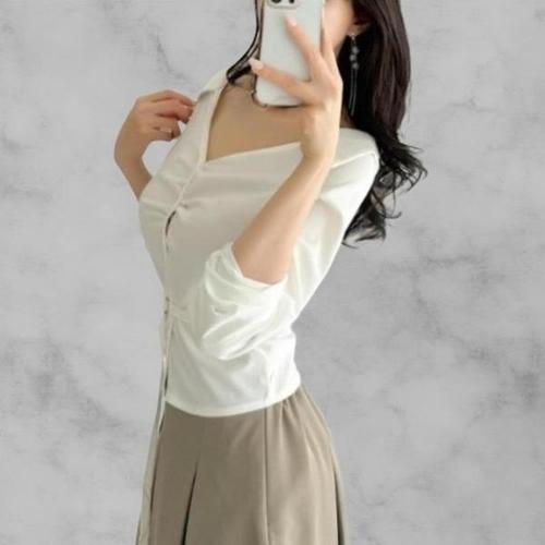 [잇수다] 캐멜리 꼬임 랩 끈 루즈핏 스판 브이넥 카라 셔츠