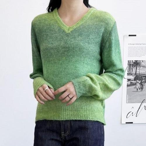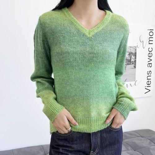 [셀럽하우스]여자 XJGK1802 그린 그라데이션 간절기 브이넥 니트 티셔츠