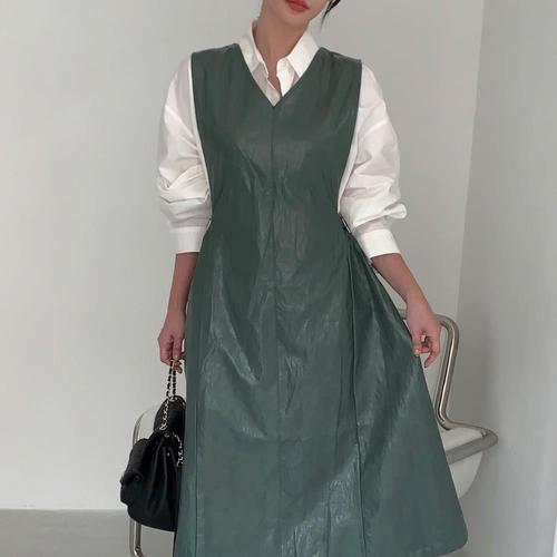 [미라클세븐]여성 브이넥 민소매 가을 롱가죽 원피스 A라인 디자인