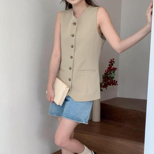 여성용 여름 린넨 베스트 조끼 롱 기장 안감 처리 브이넥 가벼운 민소매 블레이져 오피스룩 포켓