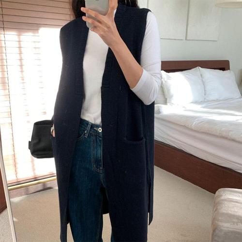 [신상오픈런]여성 브이넥 롱 니트조끼 투포켓 민소매 밑트임 울 스웨터