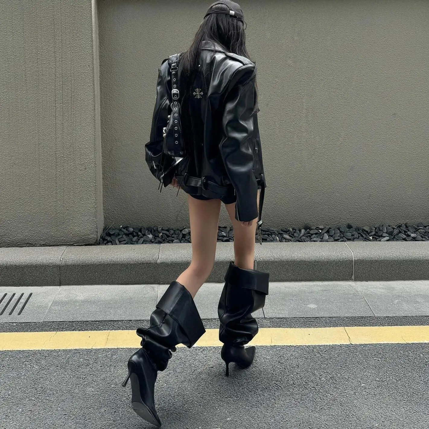 스트리트 스타일 록커 블랙 가죽 재킷 여성용 스파이시 디자인 루즈 헤비웨이트 모터사이클 재킷 아우터웨어 트렌디