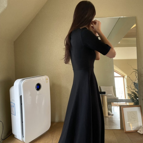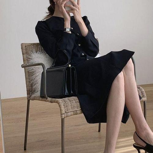 [에이치플러스몰]블랙 버튼 포인트 롱원피스 우아한 하객룩 스타일