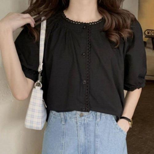 2024 여성 반팔 라운드넥 블라우스 셔츠, 단색 상의, 블랙, 화이트, 여름