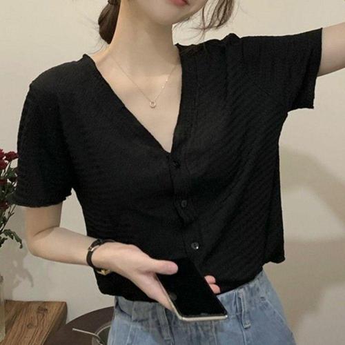 여자 여름 브이넥 블랙 셔츠 가디건 반팔 블라우스
