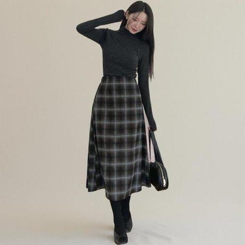 [옷자락]여자 도톰 하이웨스트 배색 체크 a라인 롱 스커트
