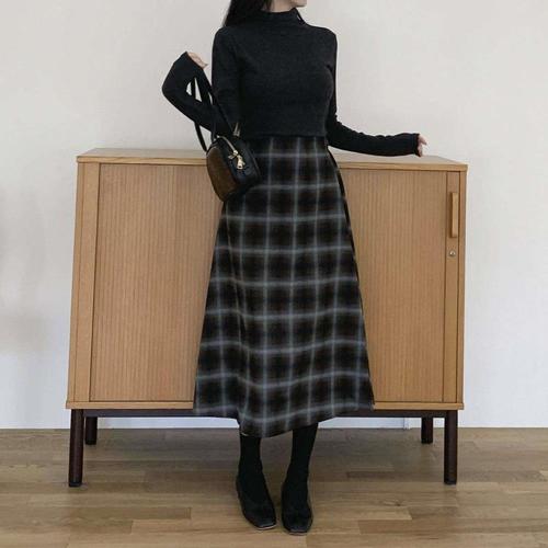 |KHK173F|여성 두꺼운 하이웨스트 체크 A라인 롱 스커트