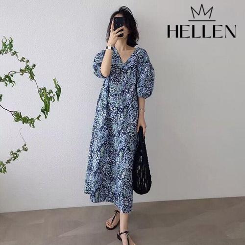 [헬렌]헬렌 퍼프 반소매 플라워 롱 바캉스 원피스 캄파블루O