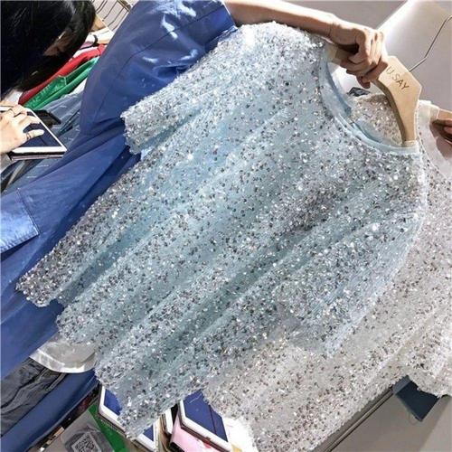 [오너클랜]인기상품 망사 스팽글 반팔 티셔츠 여성 블링 펄 포인트 여름상의 [WFLL01U_260304]