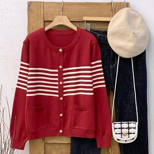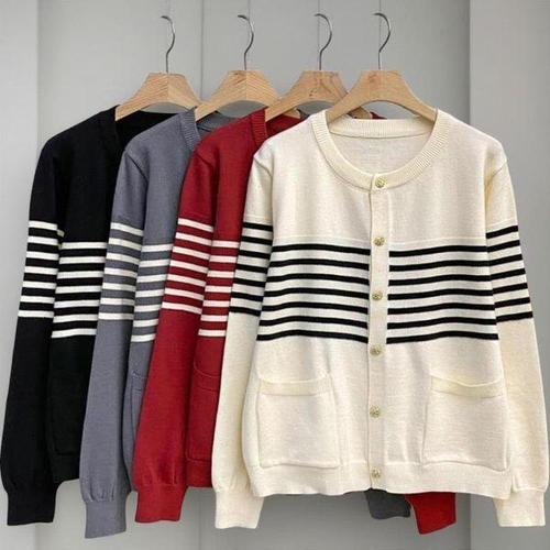 [신상오픈런]여성용 스트라이프 비스코스 라운드넥 긴팔 니트 가디건