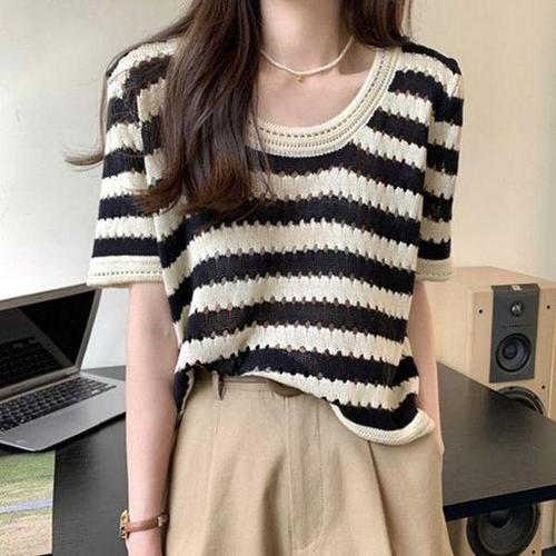 [셀러허브_여성트랜드패션]여성 펀칭 배색 니트 비치웨어 반팔 티 스트라이프