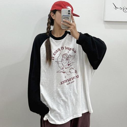 여성 라운드 얇은 긴팔 티셔츠 여성용 루즈핏 래글런 소매 프린트 배색 상의 LT