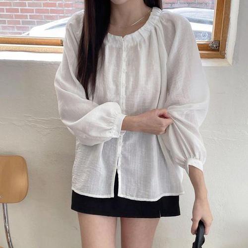 [다잇템][다잇템] 여자 롱슬리브 벌룬 프릴넥 잔주름 빅사이즈 블라우스_24548709_588872