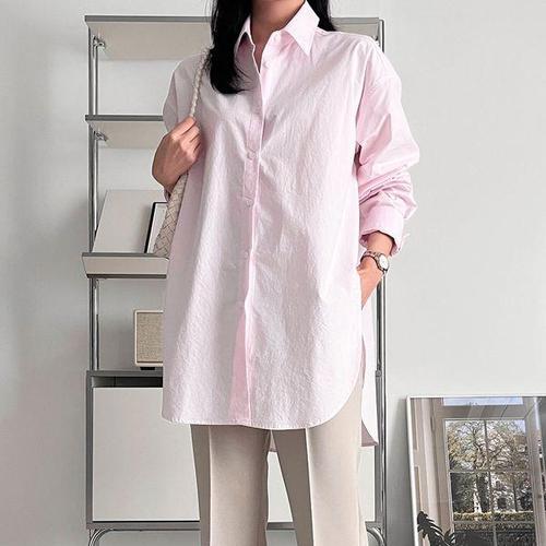 [옷자락] 여자 언발 빅사이즈 카라넥 워싱 코튼 양트임 롱 셔츠