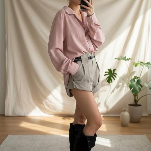 리비아레나 빅사이즈봄코디추천 슬림핏 무드 벨티드 셔츠 롱 플레어 원피스