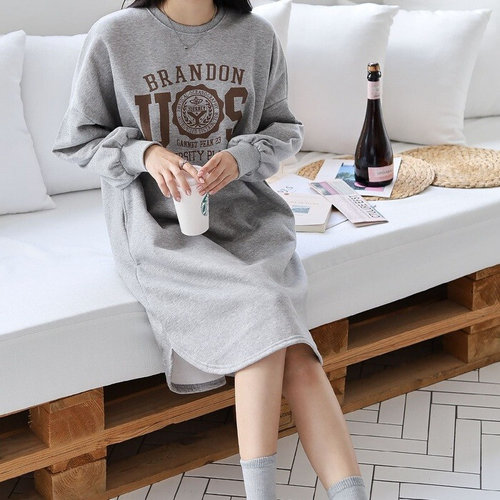 [옷자락]여성 캐주얼 무지 라운드넥 긴팔 롱 원피스