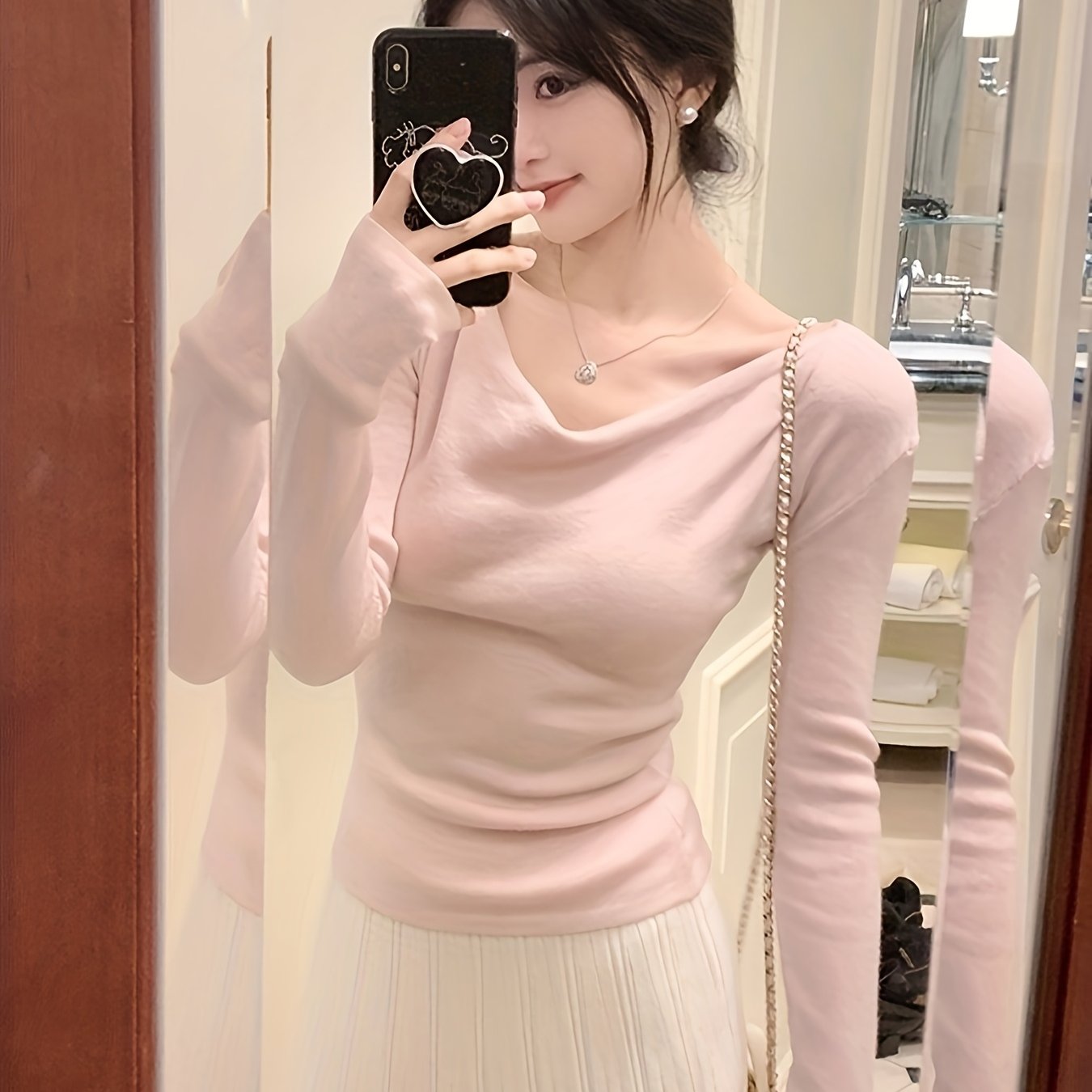 TEMU 여성용 섹시 오프숄더 긴팔 탑 - 부드럽고 신축성 있는 라운드넥 셔츠, 슬림핏 캐주얼 시크 스프링/가을, 데일리 & 포멀 이벤트룩