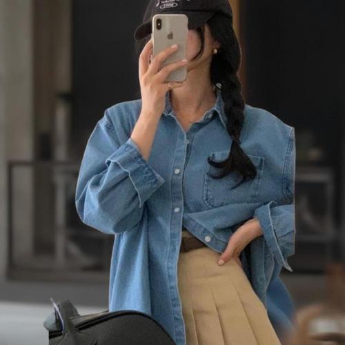 |KDH4009|여성 키치 스타일 원포켓 빅사이즈 코튼 청셔츠