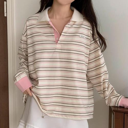 배색 피케 카라 긴팔 티셔츠 레터링 자수 여성 빅사이즈