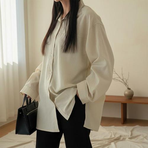|KSH4327|여성 언발란스 빅사이즈 카라넥 워싱 면 양트임 롱셔츠