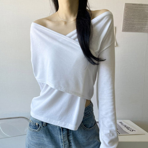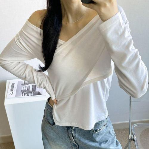 오스틱니 2025 여성 봄가을 날씬해 보이는 V넥 오픈 숄더 디자인 빅사이즈 트임 디자인 긴팔 티셔츠
