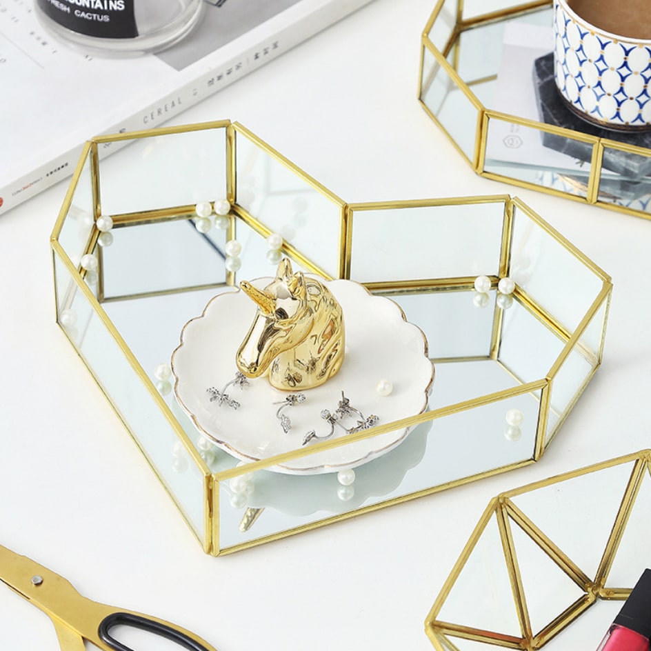 악세사리 인테리어 엔틱 화장품보관함 유리골드 하트 미러트레이