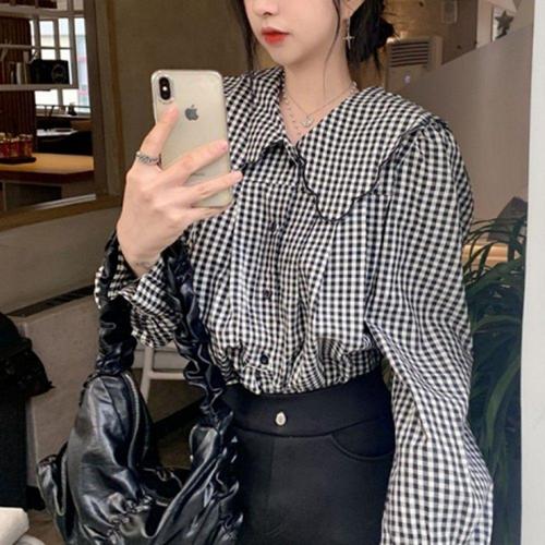 [옷은날개] 얼굴 작아보이는 빅카라 체크 벌룬소매 셔츠 블라우스