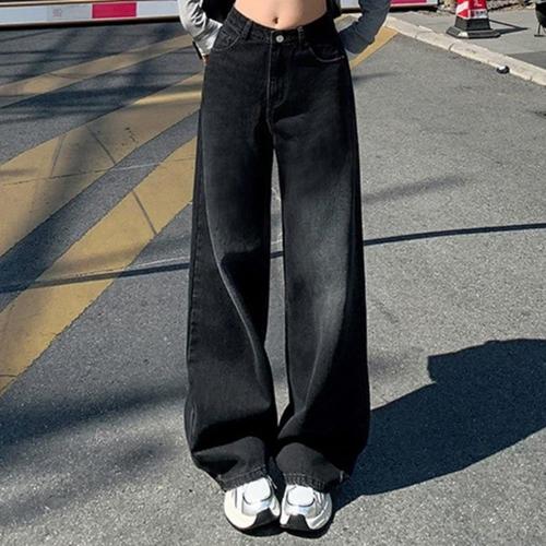 [옷자락]여성 힙무드 빈티지 워싱 블랙진 와이드 일자 데님