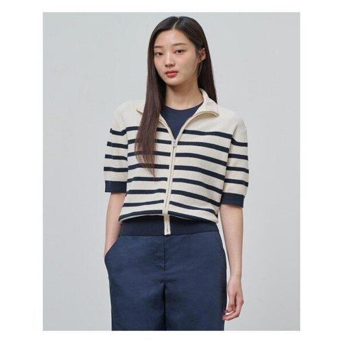 [빈폴레이디스]코튼 혼방 스트라이프 반소매 집업 카디건 - 아이보리 (BF455AC020)