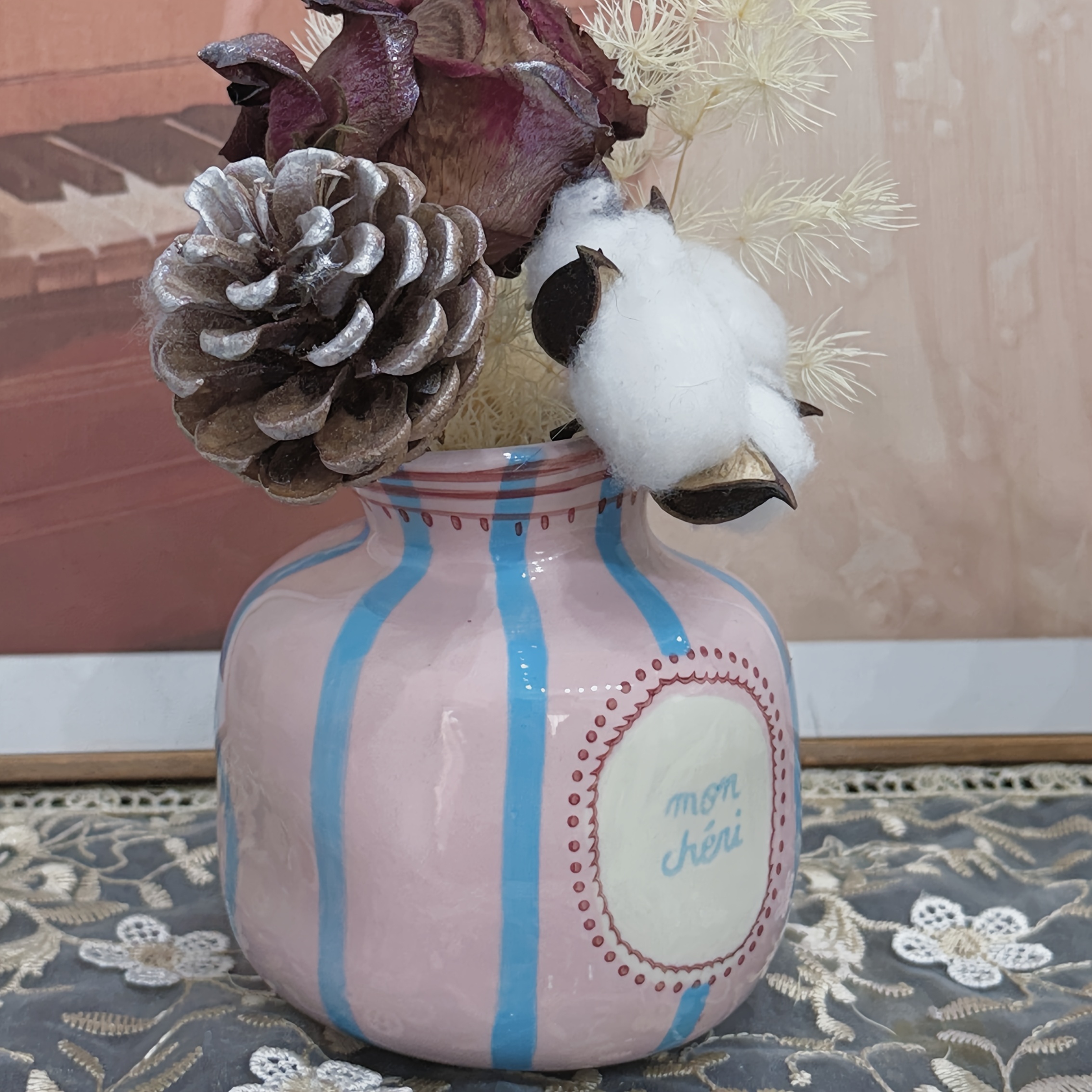TEMU 1개, 새로운 창의적인 손으로 그린 세라믹 소형 꽃병, 홈 세라믹 장식 꽃병, 녹색 및 분홍색으로 디자인됨, 모던 홈 꽃병 장식, 수경 재배 꽃병