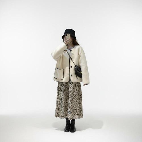 [옷자락] 여성 뽀글이 노카라 배색 테이핑 포켓 루즈핏 가디건