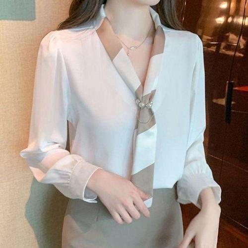 봄 패션 버튼 업 새틴 실크 셔츠 빈티지 블라우스 여성 화이트 탑 레이디 긴 소매 여성 루즈 스트리트 셔츠 11355