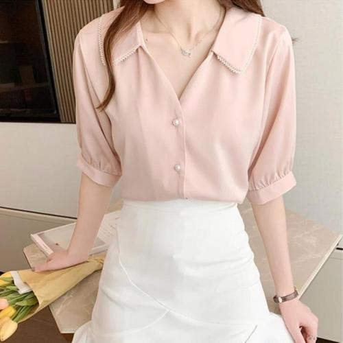 [다잇템]여자 시폰 새틴 로맨틱 카라 진주 블라우스 (10616036A)