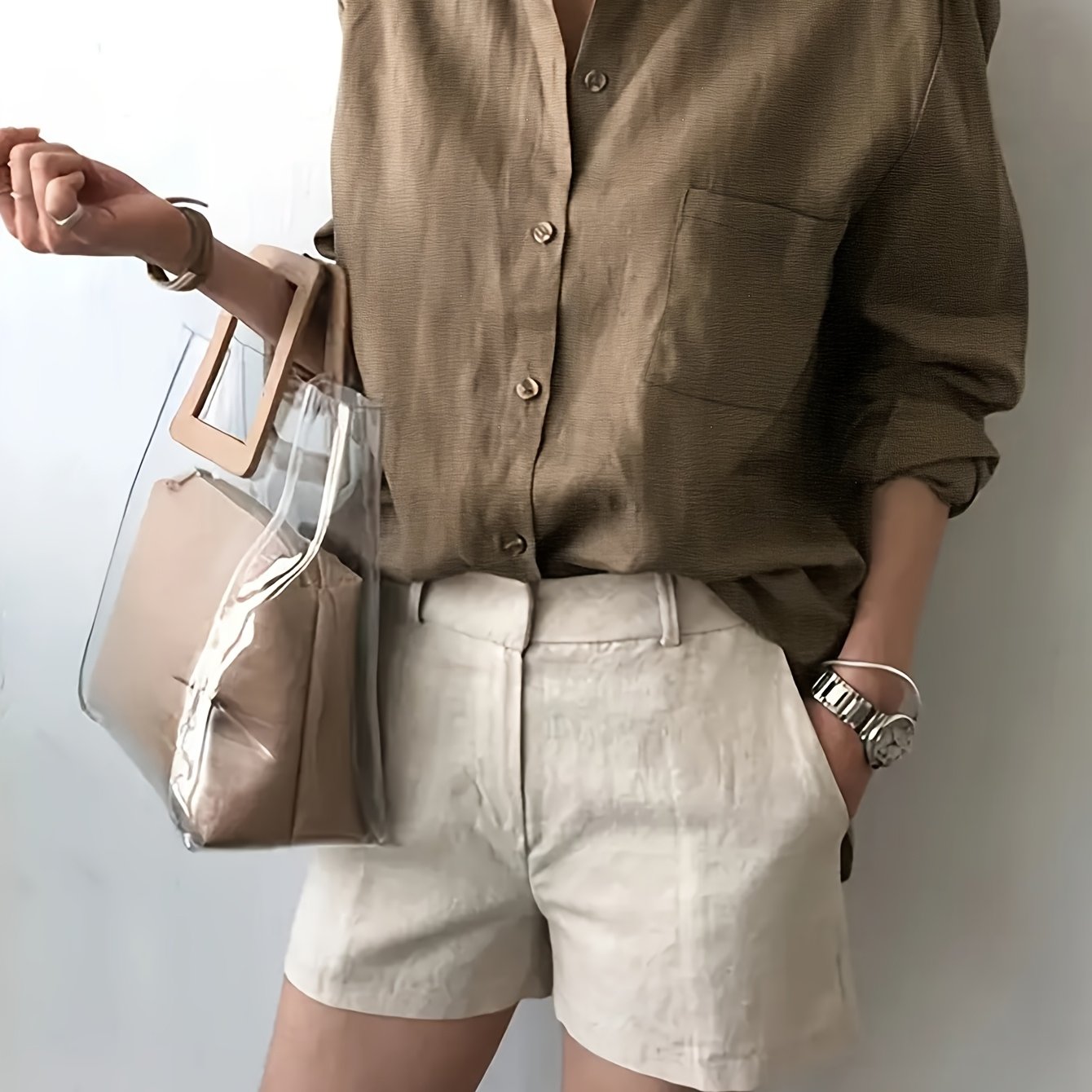 TEMU 웨이브 엣지가 있는 봄용 브라운 플레어 소매 버튼 프론트 셔츠