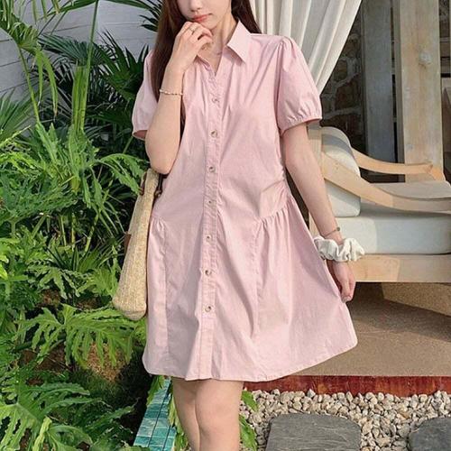 [셀럽하우스]여자 LBUM3821 여름 반팔 원피스 셔츠 셔링 루즈핏 카라 3컬러