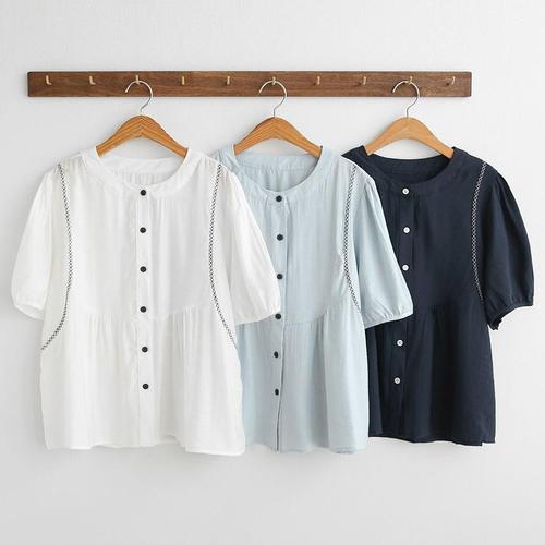 [옷자락] 여성 시스루 라운드 버튼 셔링 블라우스 여름용