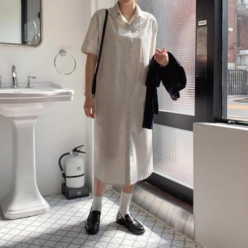 [옷자락]여자 여름 스트라이프 반팔 셔츠 랩 단추 롱 원피스