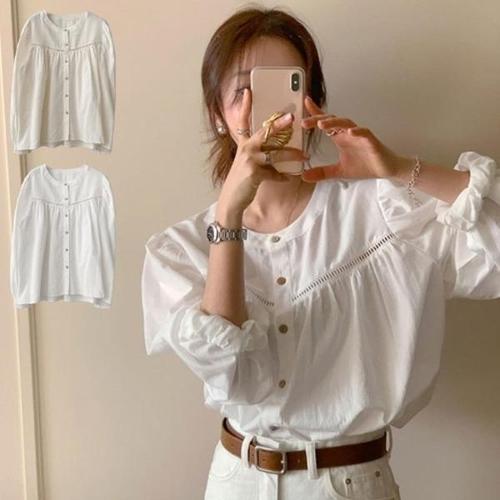 [다잇템][다잇템] 여자 롱슬리브 벌룬 소매 포인트 펀칭 카라없는 셔츠_23918745_588872